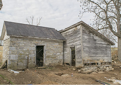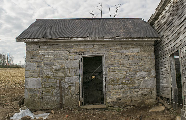 The stone smokehouse was situated in the north yard of the house just to the north of the brick wash house/summer kitchen. This 3.81 x 5.33-m (12.5 x 17.5-ft.) structure was made entirely of mortared stone with walls approximately 0.46 m (1.5 ft.) thick. The stone walls were well-built and square, with large stone quoins in each corner, filled in with smaller dress stones that formed the bulk of the walls. While used as a smokehouse in its later life it appears to have had an earlier function and once had a wider doorway with a likely covered overhang.