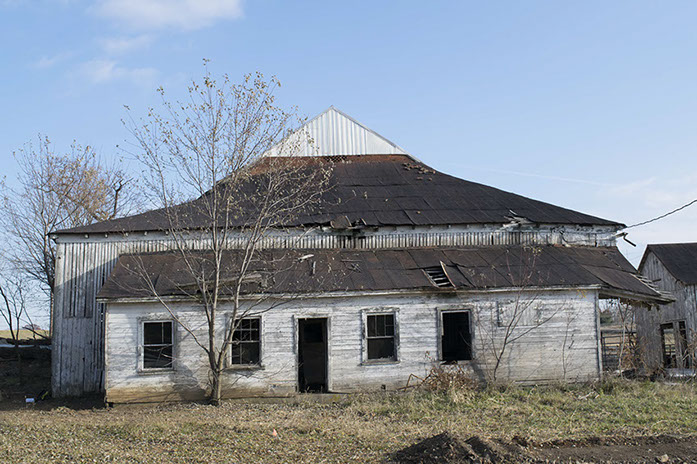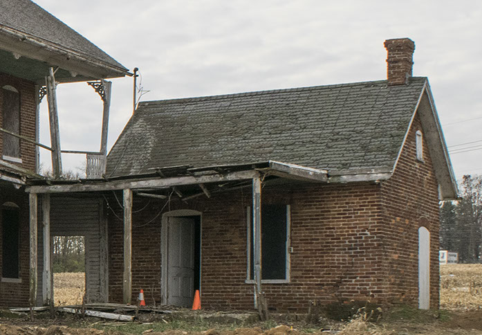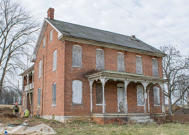 The brick farmhouse was built by Samuel M. Kendle about 1895. It was a vernacular/Italianate-style T-shaped house, with a two-story, gable-end, main block, and a centered, two-story rear ell. The front of the house featured a small roofed concrete porch with concrete steps leading up to it. The porch was covered by a small roof supported by decorative wooden posts. The rear ell of the house had two-story porches on the north and south sides. The lower porches had concrete decking installed in 1934, according to a stamp in the concrete, which dates the concrete surface to the Luther Grove occupation
