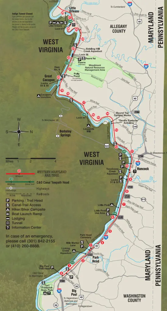 The Western Maryland Rail Trail is about 23 miles and parallels the C&O Canal for its entire length. With a paved, linear trail, it is suited for anyone seeking a pleasant, leisurely outdoor experience. The easy grade and paved surface, makes this trail ideal for families, the elderly, and persons with limited mobility. The Rail Trail is wheelchair accessible and pets are permitted on the trail.