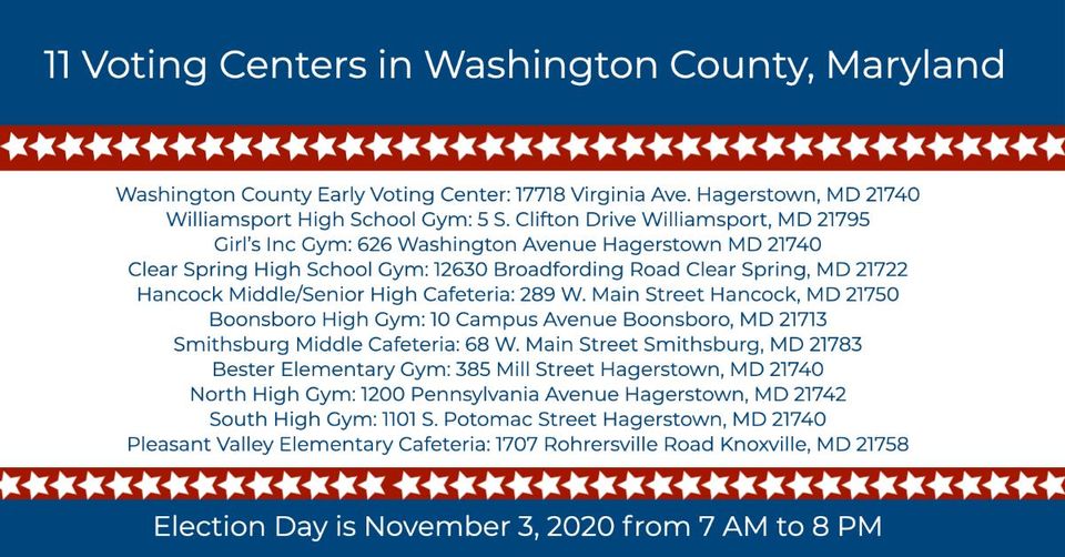 If you cannot vote by mail or want to vote in person, Marylanders can vote during early voting or on election day. Early voting will be held from 7 am to 8 pm beginning October 26 through November 2, 2020. Election Day voting will be held 7:00 a.m. to 8:00 p.m. on November 3. A list of voting centers in Washington County are listed below.
