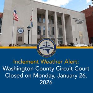 Washington County Circuit Court Announces Delayed Opening on Tuesday, January 27 HAGERSTOWN, MD (January 26, 2026) – The Washington County Circuit Court will open at 9:30 a.m. on Tuesday, January 27, 2026.All court staff should report to work at 9:00 a.m., with court dockets scheduled to begin at 10:30 a.m. All cases on