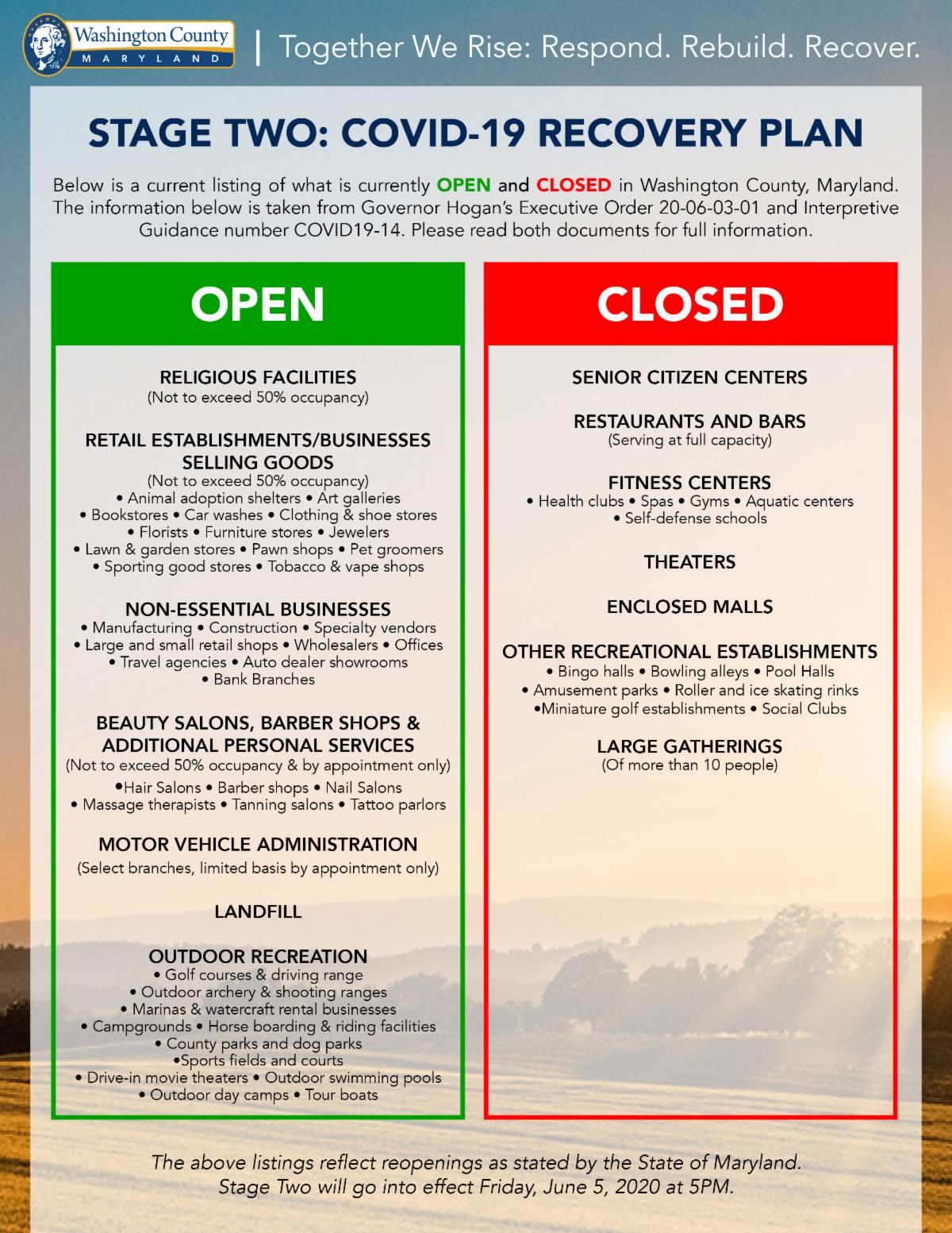 To stay updated on the Stages of Reopening and Recovery in Washington County, Maryland, please visit www.washcorises.net.