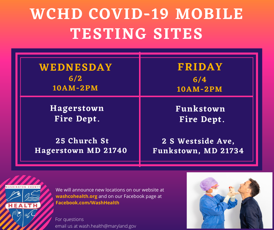 • Health Department Spring Mobile Testing Sites: The mobile COVID-19 testing site will run on Mondays, Wednesdays and Fridays from 10am-2pm. Mondays and Wednesdays the testing site will be located at various locations in Hagerstown. Each Friday the testing site will be mobile throughout the county going to different municipalities such as Hancock, Smithburg, Cascade, etc.