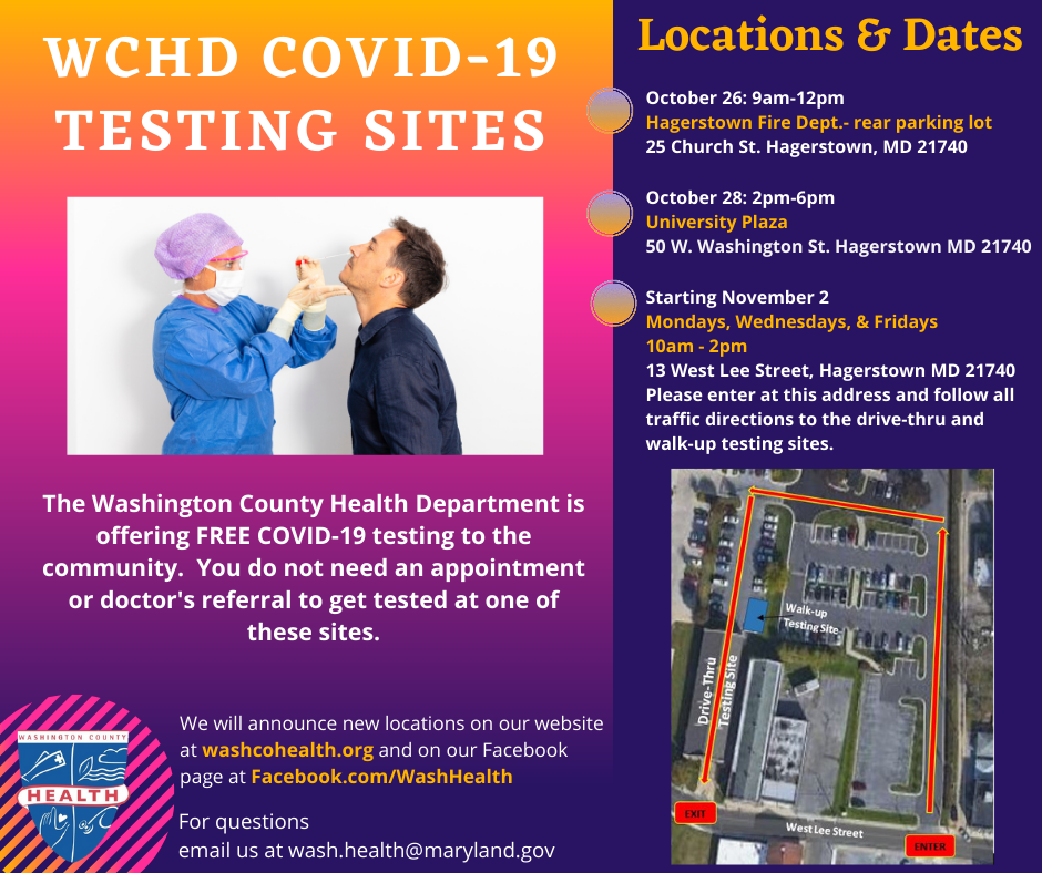 Starting November 2, 2020 the Washington County Health Department will be offering free drive-thru and walk-up COVID-19 testing at 13 West Lee Street in Hagerstown. Testing will be available Mondays, Wednesdays and Fridays from 10am-2pm. Please follow all traffic signs when entering through the Lee Street entrance.