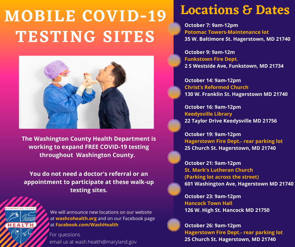 Washington County Health Department has launched mobile testing sites throughout Washington County. Testing at these sites are free and you do not need a doctor’s referral or an appointment to be tested.