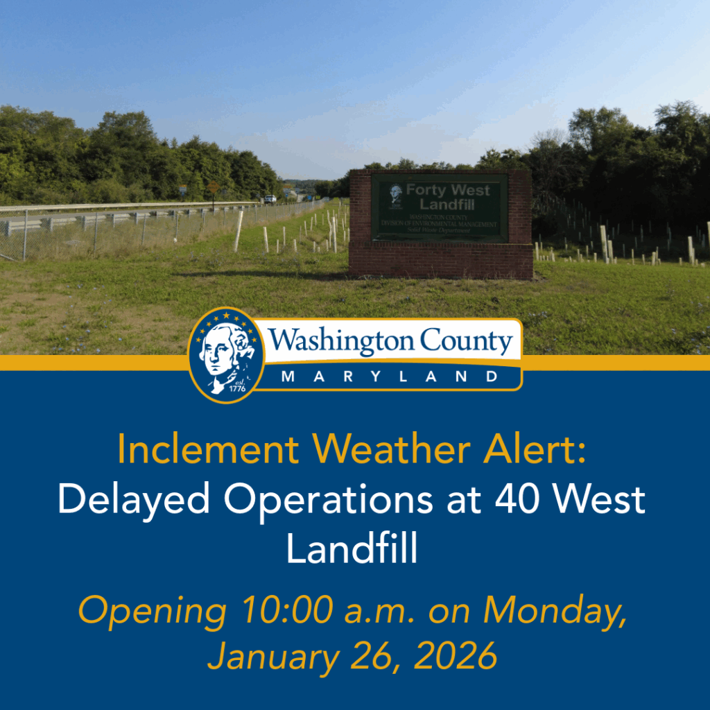 HAGERSTOWN, MD (January 25, 2026) – Due to inclement weather conditions, the Washington County Solid Waste and Recycling Department announces services at the 40 West Landfill will operate on a delayed schedule. The 40 West Landfill will be opening at 10:00 a.m. on Monday, January 26, 2026.