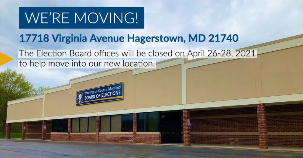 HAGERSTOWN, MD (April 19, 2021) – Effective April 29, 2021, the Washington County Board of Elections offices will be located at 17718 Virginia Avenue, Hagerstown, MD 21740. To allow time for a smooth transition into the new location, the Board of Election offices will be closed April 26-28, 2021.