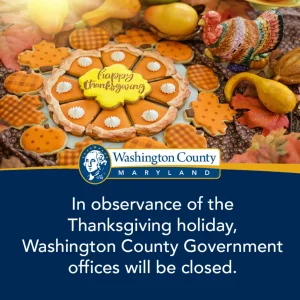 HAGERSTOWN, MD (November 21, 2022) – In observance of the Thanksgiving holiday, Washington County Government offices will close at 1:00 p.m. on Wednesday, November 23, 2022, and remain closed on Thursday, November 24, and Friday, November 25, 2022. County services will operate as listed below: The Hagerstown Regional Airport terminal and airfield will operate