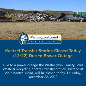 HAGERSTOWN, MD (December 22, 2022) – Due to a power outage the Washington County Solid Waste & Recycling Kaetzel transfer station, located at 2926 Kaetzel Road, will be closed today, Thursday, December 22, 2022.   We will provide an update as soon as the issue is corrected. We apologize for any inconvenience.