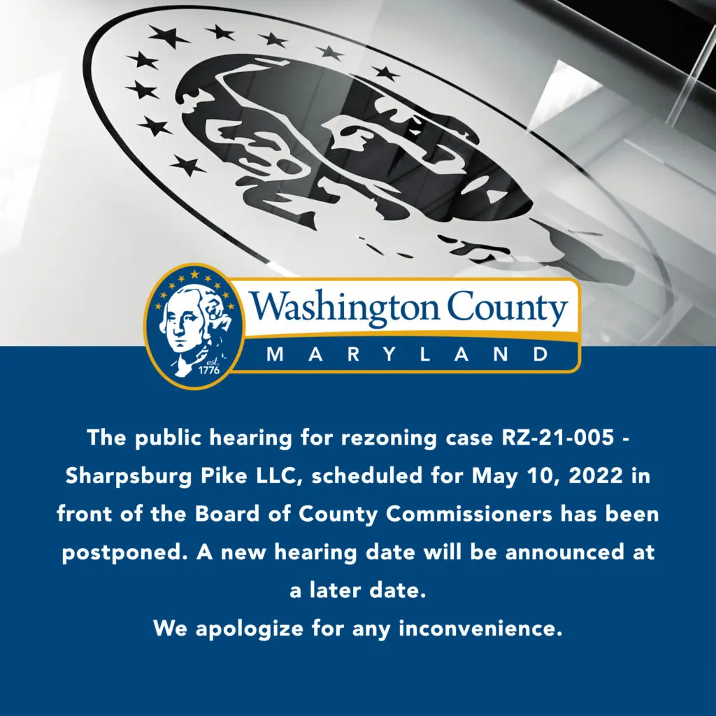 HAGERSTOWN, MD (May 9, 2022) – Washington County Department of Planning and Zoning announces the public hearing for rezoning case RZ-21-005 – Sharpsburg Pike LLC, scheduled for May 10, 2022, in front of the Board of County Commissioners has been postponed. A new hearing date will be announced at a later date. We apologize for any inconvenience.