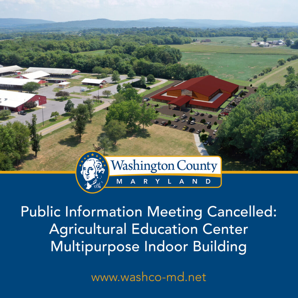 Hagerstown, MD (August 13, 2024) The Washington County Agricultural Education Center announces the cancellation of the public information meeting concerning the proposed Agricultural Education Center Multipurpose Indoor Building. The meeting, which was originally scheduled for Wednesday, August 21st at 6:00 PM, has been canceled and will not be rescheduled at this time.