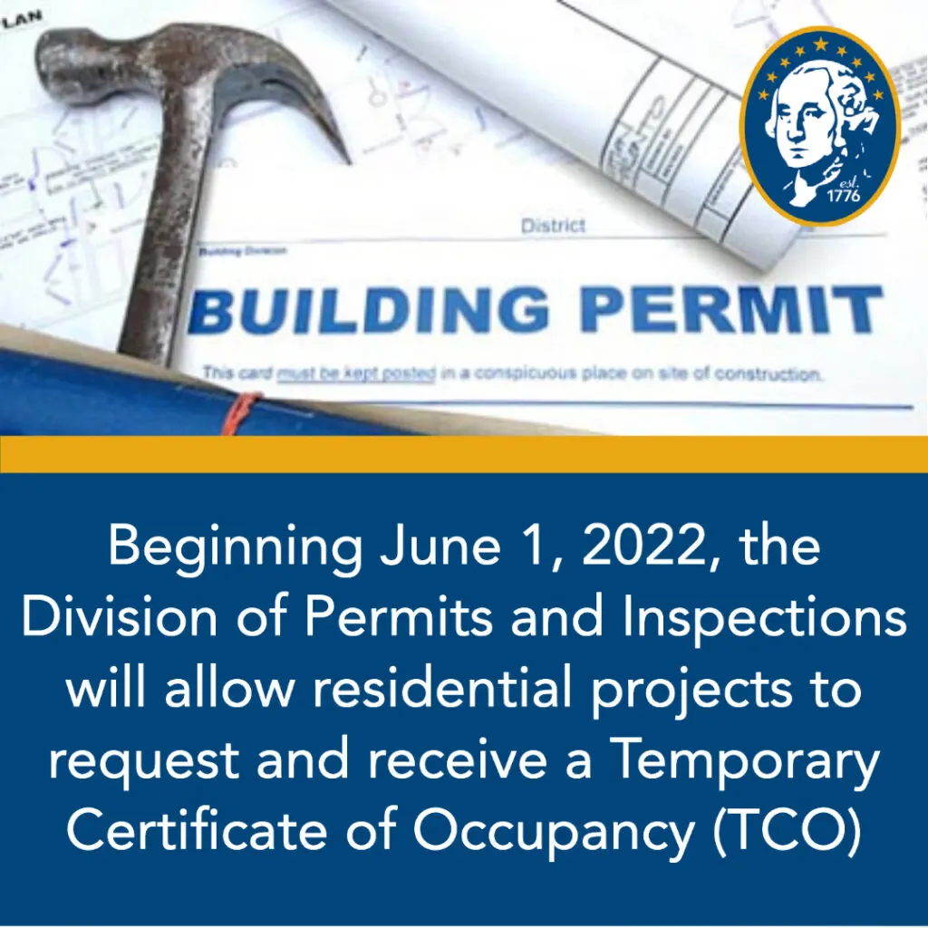 HAGERSTOWN, MD (May 27, 2022) – Beginning June 1, 2022, the Division of Permits and Inspections will allow residential projects to request and receive a Temporary Certificate of Occupancy (TCO). This will permit residential projects to obtain occupancy prior to receiving all final inspection approvals due to extenuating circumstances such as material shortages, weather, paving, grading, and other issues as determined by the Director/Code Official as meeting the intent of the policy.