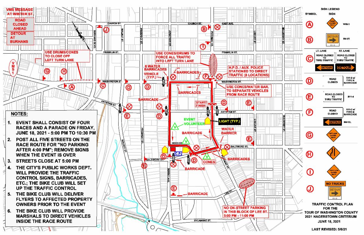 On the evening of Friday, June 18th, the Hagerstown Downtown Criterium bicycle race will be held on streets in the City Center. The race route consists of a loop on portions of W. Washington Street, S. Potomac Street, W. Baltimore Street, Hood Street, and Summit Avenue; the race route will be closed to all vehicular traffic during the event, and detour plans will be implemented to direct traffic around the closures. The attached exhibit shows the race route and the proposed street closures and detours. The affected streets will close to traffic at 5:00 PM, and are expected to be reopened to traffic by approximately 10:30 PM.