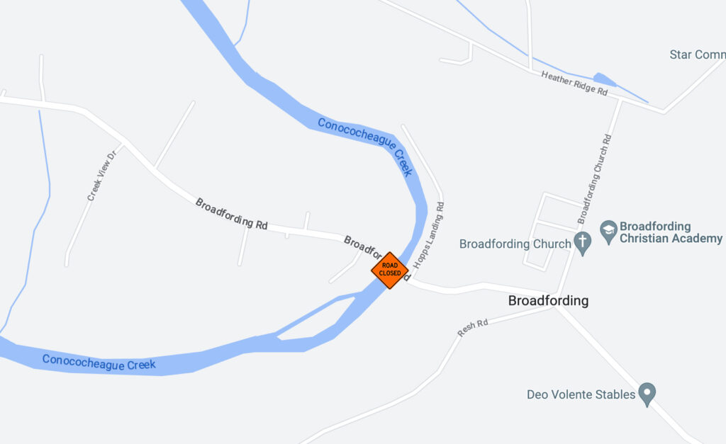 HAGERSTOWN, MD (August 1, 2023) – The Washington County Highway Department announces an upcoming road closure on Broadfording Road. The bridge on Broadfording Road over Conocheague Creek will be closed between August 14-18 from 7:00 a.m. to 4:00 p.m. daily to remove debris from under the bridge.
