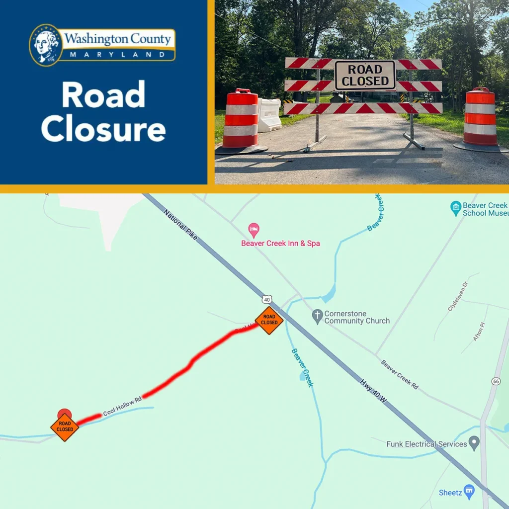 HAGERSTOWN, MD (February 14, 2024) – The Washington County Highway Department announces an upcoming road closure on Cool Hollow Road, between National Pike (Rt 40) and 20148 Cool Hollow Road, for tree removal. This closure will be in effect on Thursday, February 15, 2024, between 8:00 am and 2:00 pm.