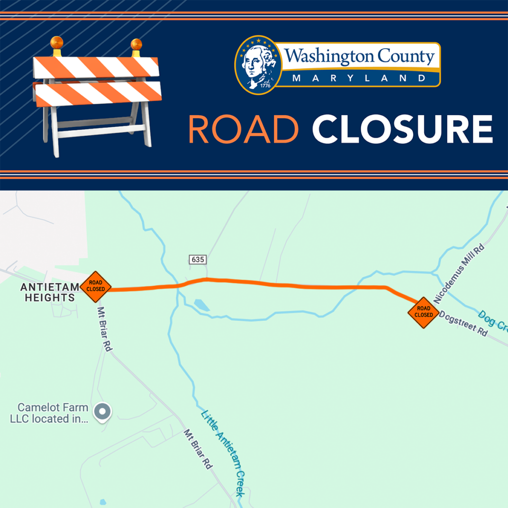 KEEDYSVILLE, MD (April 4, 2025) – The Washington County Highway Department announces an upcoming road closure on Dogstreet Road, between Mt. Briar Road and Nicodemus Mill Road on Tuesday, April 8, 2025 between 8:00 am and 2:00 pm for a pipe replacement.