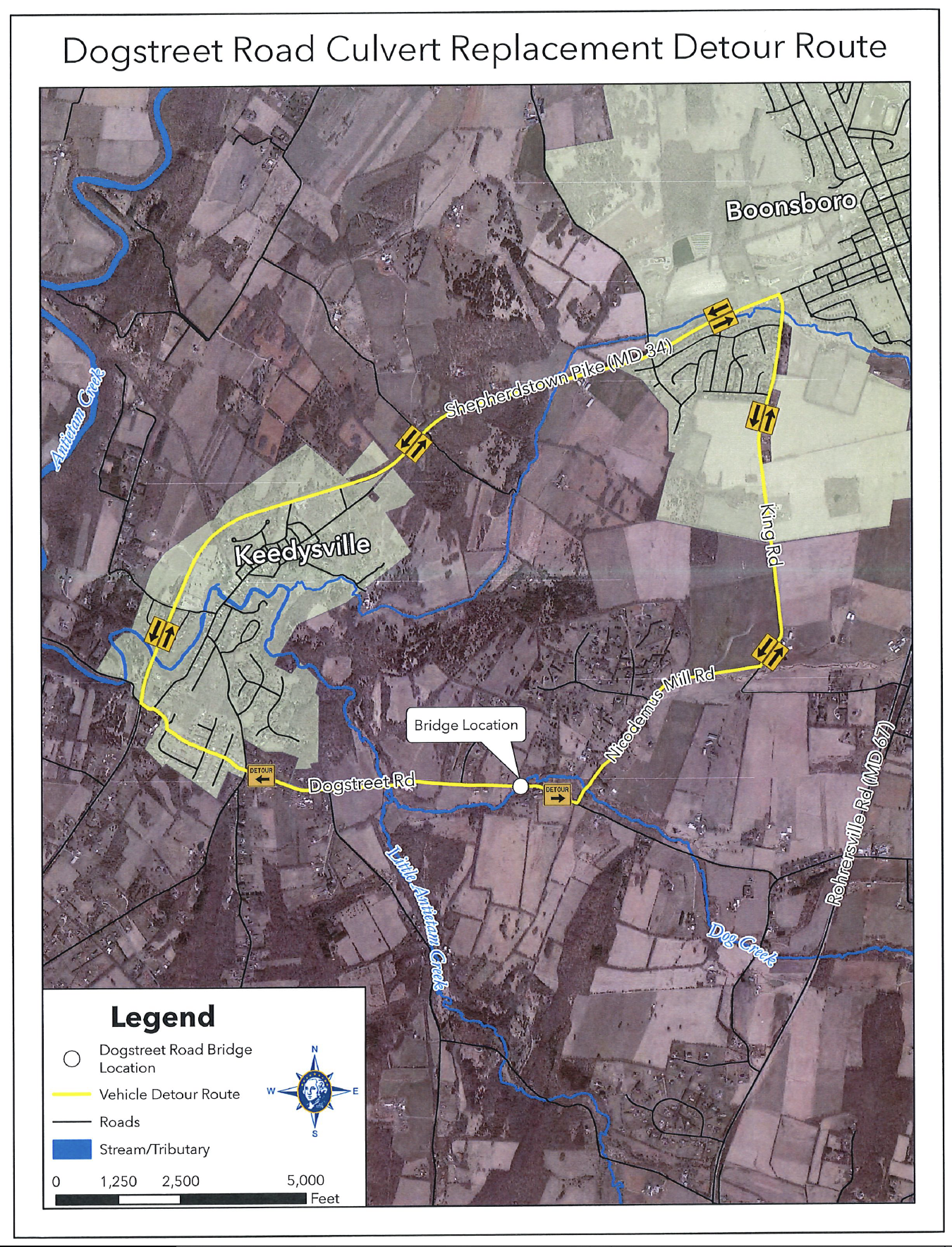 The Washington County Division of Engineering announces Dogstreet Road at Dog Creek (19758 Dogstreet Road) will be closed to through traffic, effective Monday, September 18, 2023, at 8:00 am, in order to begin the work on the replacement of the culvert. Completion of the project is scheduled for May 2024.