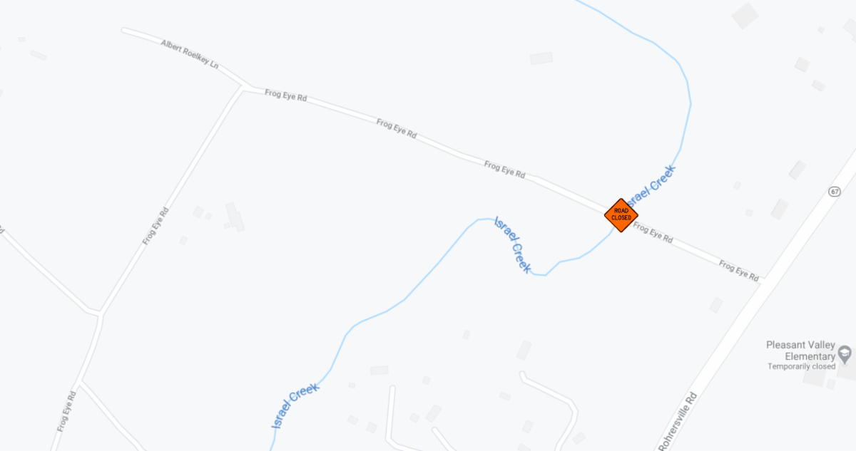 Washington County Highway Department announces a road closure at Frog Eye Road at the bridge over Israel Creek. The road will be closed on Monday, July 13, 2020 from 7:00 a.m. – 2:30 p.m. for bridge repairs, weather permitting.