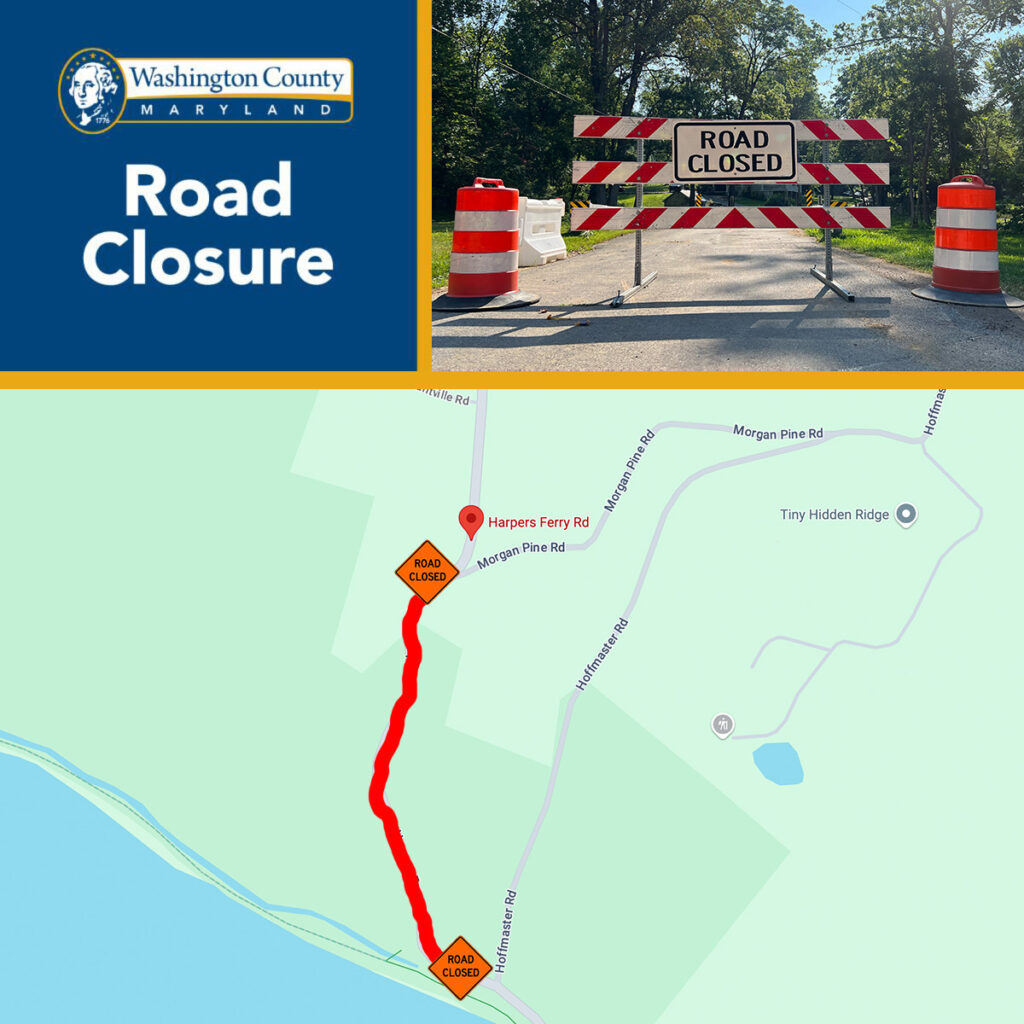 HAGERSTOWN, MD (October 3, 2024) – The Washington County Highways Department announces the closure of Harpers Ferry Road, between Morgan Pine Road and the lower end of Hoffmaster Road. This closure will remain in effect today, Thursday, October 3, 2024, between 8:30 am and noon.
