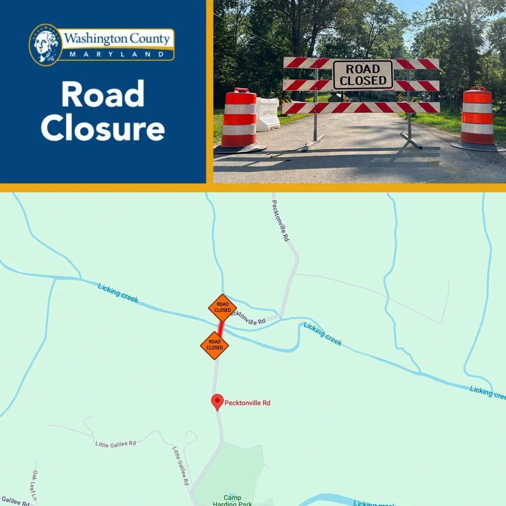 HAGERSTOWN, MD (November 28, 2023) – The Washington County Highway Department announces it will be closing Pecktonville Rd at the bridge over Licking Creek today, November 28, 2023, between 10:00 am and 2:00 pm.