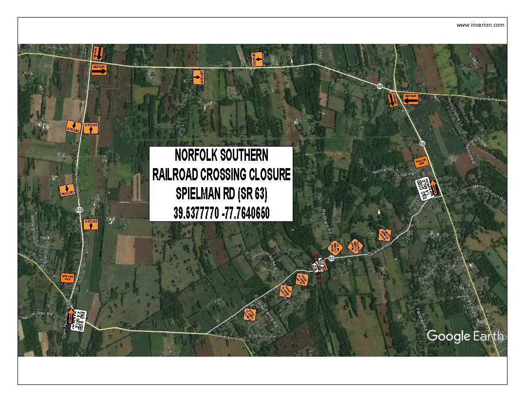Norfolk Southern will be working on the railroad crossing at Spielman Road/MD 63 from Monday, December 6 through Wednesday, December 8, 2021. The crossing will be closed at 8:30 a.m. on Monday, December 6th, and will remain closed until the repair is complete.