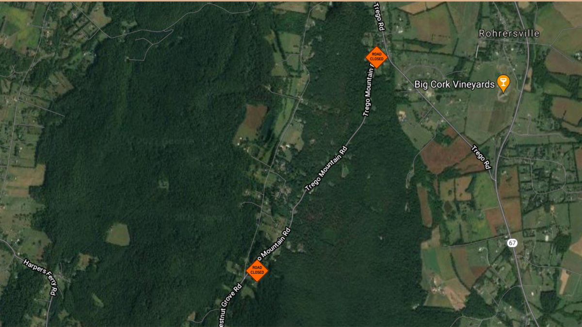 Washington County Highway Department announces a road closure on Trego Mountain Road from Chestnut Grove Road to Trego Road on Wednesday, May 19, 2021. The road will be closed for pipe replacement beginning at 8:15 a.m. until 2:30 p.m.