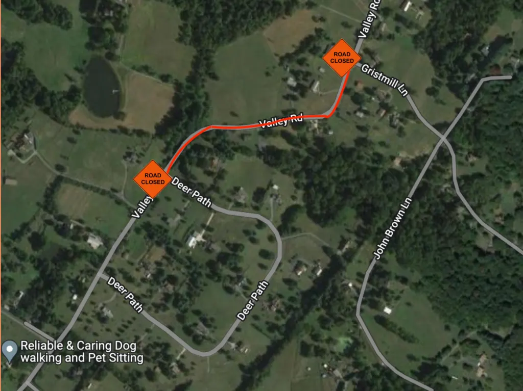 HAGERSTOWN, MD (September 17, 2022) – The Washington County Highway Department announces a road closure on Valley Road between Deer Path and Gristmill Lane. The road will be closed on Monday, September 19, 2022, from 8:30 a.m. until 3:00 p.m. for pipe replacement.