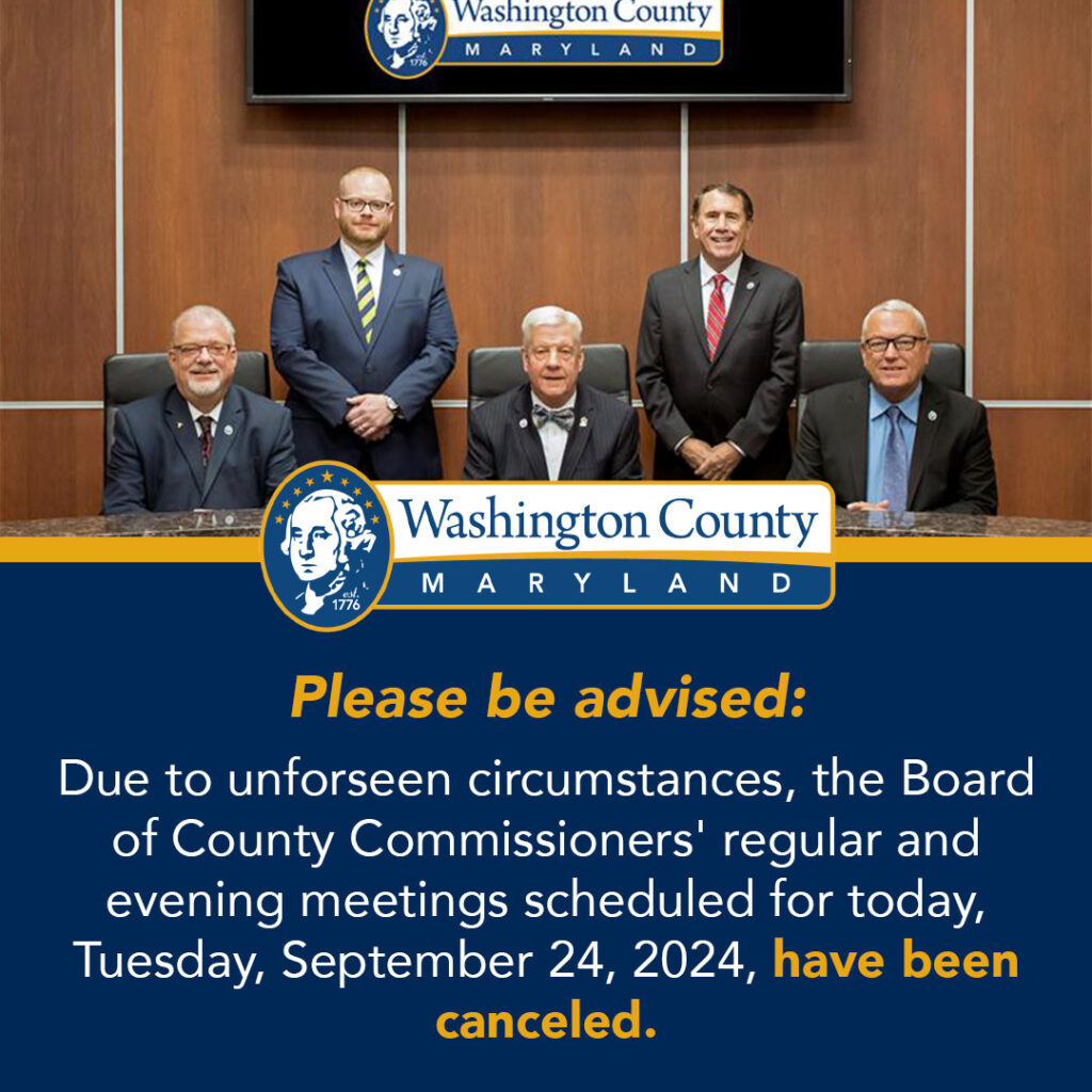 HAGERSTOWN, MD (September 24, 2024) – Due to unforeseen circumstances, the Washington County Board of County Commissioners meeting scheduled for today, Tuesday, September 24, 2024, at 9:00 AM, along with the evening meeting with the Town of Sharpsburg, has been cancelled.