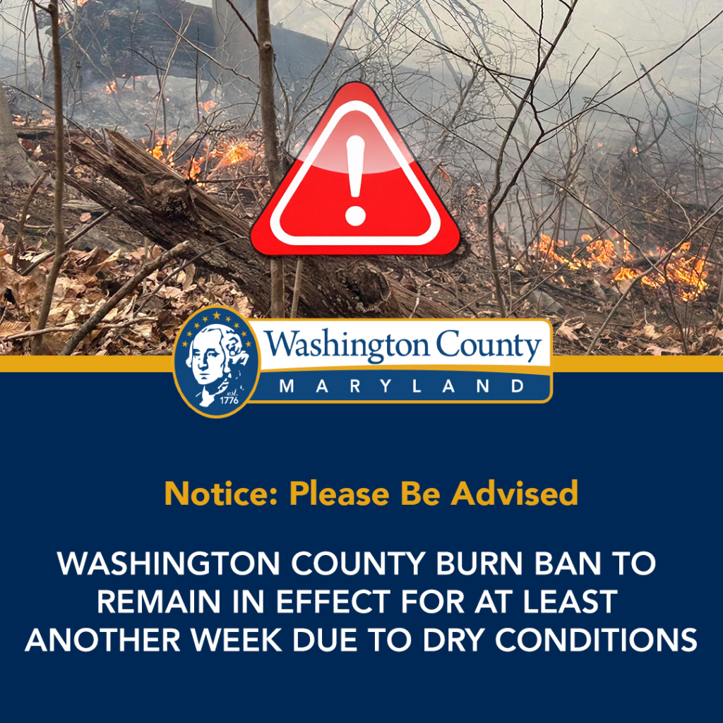 Washington County, MD (March 24, 2025) – The Washington County Board of County Commissioners announces that the countywide burn ban will remain in effect for at least another week due to ongoing dry conditions and a forecast with minimal rain. Officials will continue to monitor weather conditions and reassess the ban on Monday, March 31, 2025, to determine if it should be lifted or extended further.