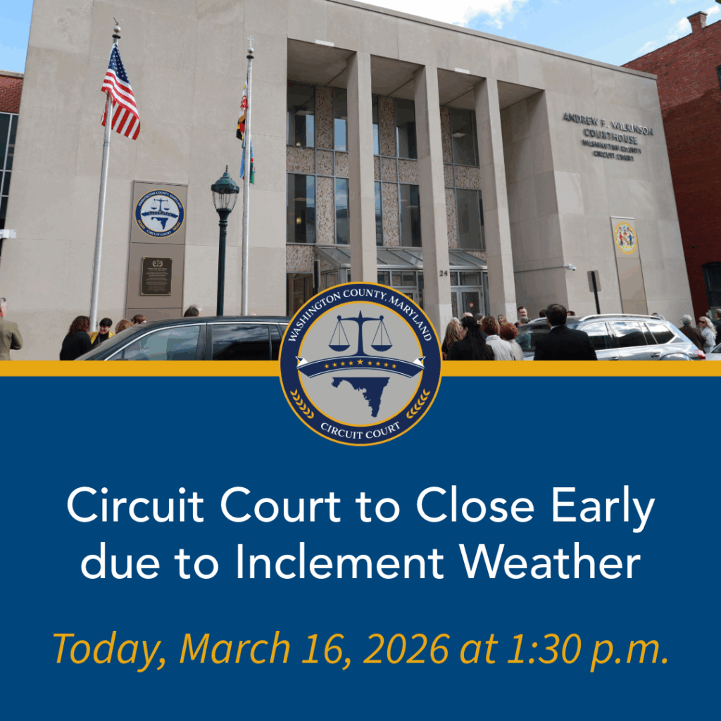 | HAGERSTOWN, MD (March 16, 2026) – The Washington County Circuit Court will be closing at 1:30 p.m. today, Monday, March 16, 2026, due to forecasted inclement weather. Residents are encouraged to monitor official County communications for the latest information regarding closures and schedule changes, as well as the Washington County Circuit Court website or contact the courthouse directly. |