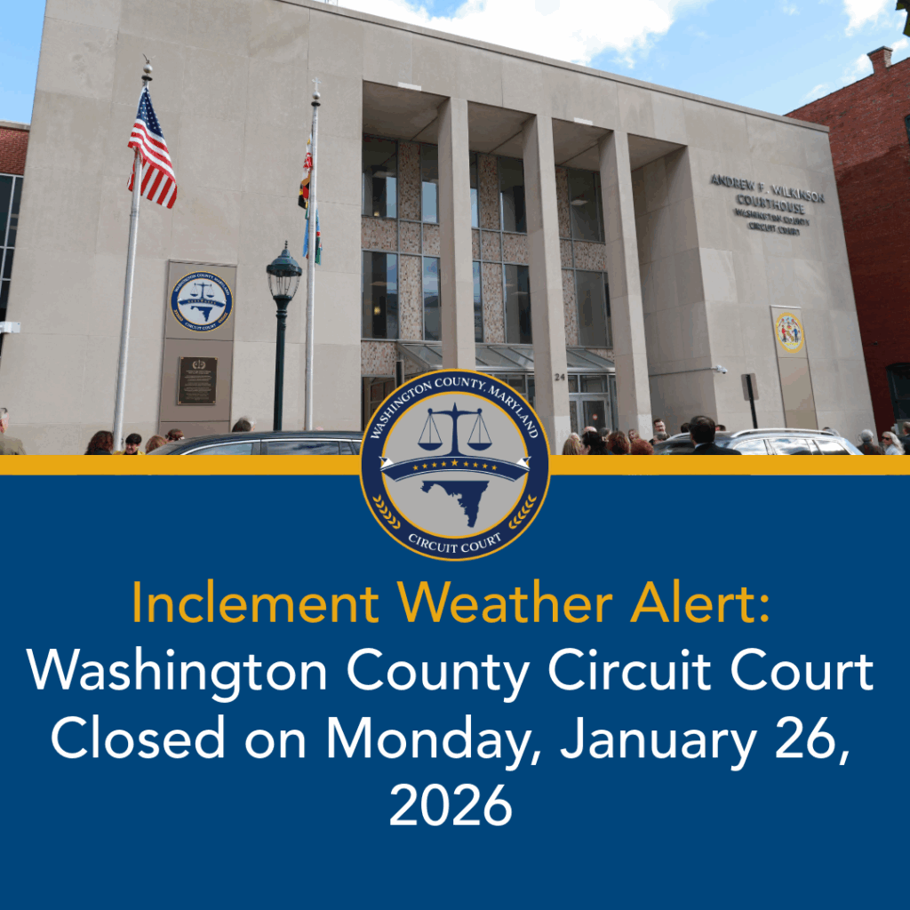 HAGERSTOWN, MD (January 23, 2026) – The Washington County Circuit Court will be closed on Monday, January 26, 2026, due to inclement weather.All jurors who are scheduled for jury service next week are reminded to call the jury information line at 301-739-3440 on Monday evening to determine whether their service is required on Tuesday, January 27, 2026.
