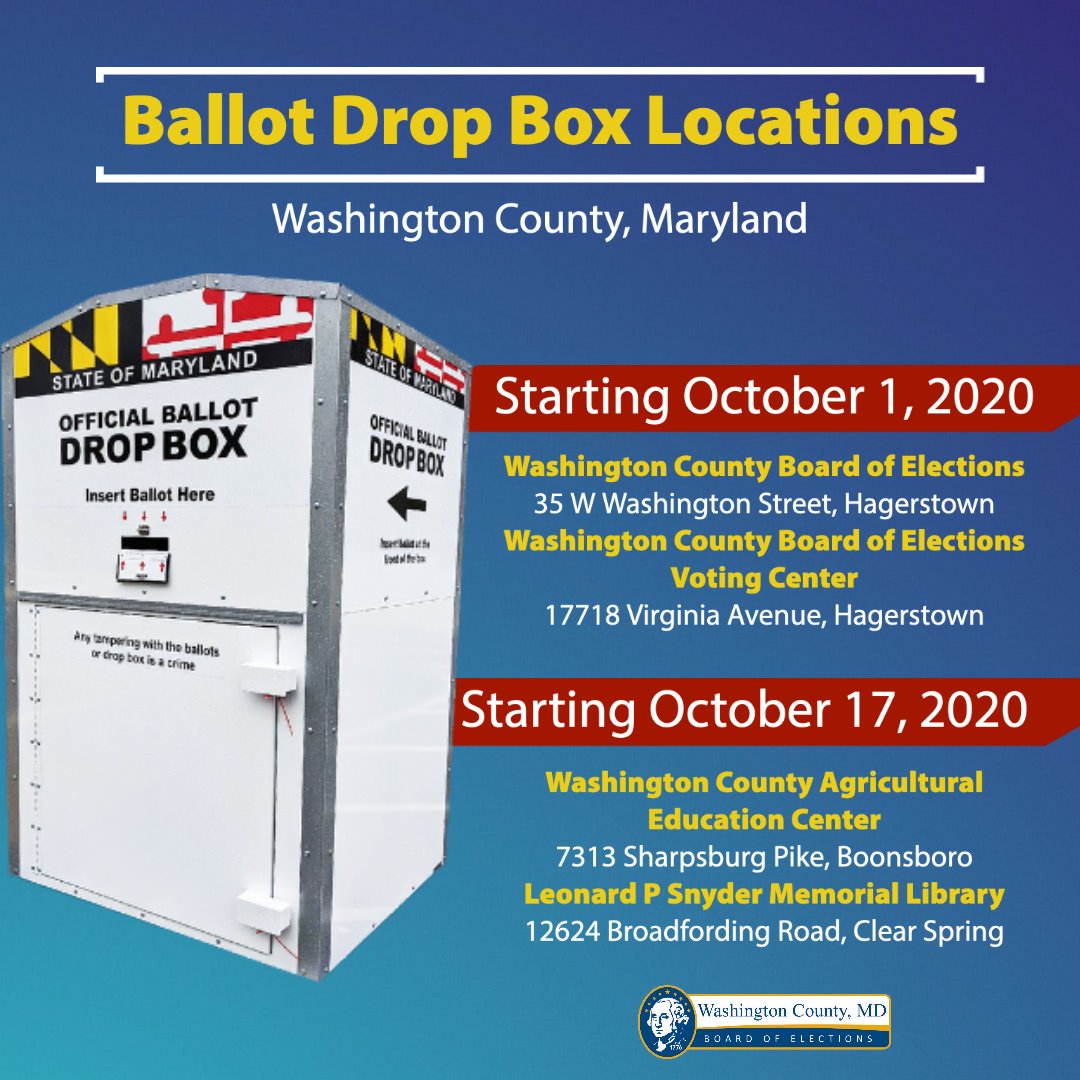 County residents may also opt to participate in Early Voting which will take place beginning Monday, October 26, 2020 – Monday, November 2, 2020 from 7:00 a.m. – 8:00 p.m. The location for Early Voting is Washington County Early Voting Center, 17718 Virginia Avenue, Hagerstown, MD 21740.