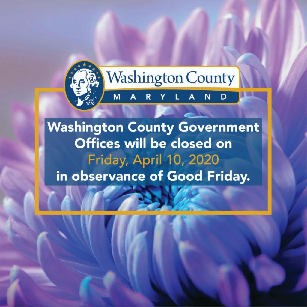 HAGERSTOWN, MD (April 6, 2020) – In observance of Good Friday, Washington County Government offices will be closed on Friday, April 10, 2020. County services will operate as listed below: