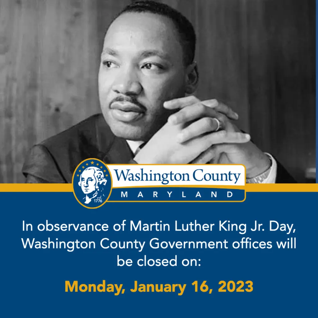 HAGERSTOWN, MD (January 12, 2023) – In observance of Martin Luther King Day, Washington County Government offices will be closed on Monday, January 16, 2023. County services will operate as listed below: