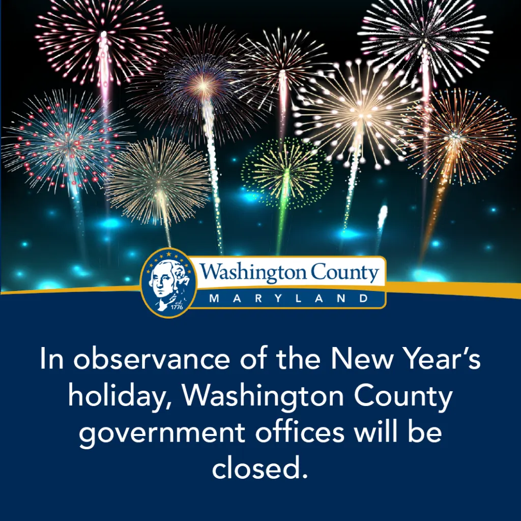 HAGERSTOWN, MD (December 23, 2022) – In observance of New Year’s, Washington County Government offices will close at 1:00 p.m. on Thursday, December 29, 2022, and remain closed on Friday, December 30, 2022, and Monday, January 2, 2023. County services will operate as listed below: