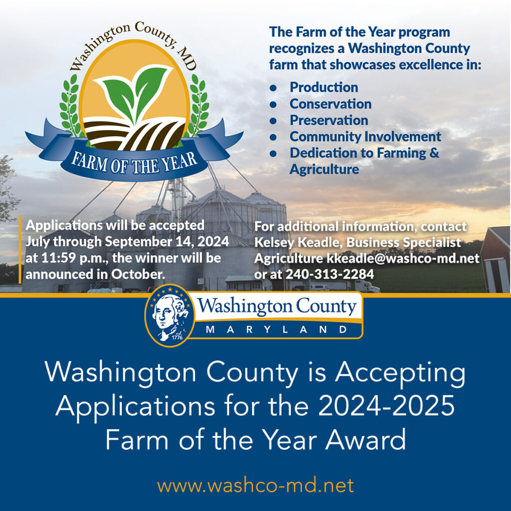Washington County, Maryland is home to many rich agricultural lands yielding essential products and commodities that support our community, state, and nation. The Washington County Farm of the Year award is designed to recognize and honor one outstanding farm and farm family exemplifying this rich agricultural heritage through proficiency of production, agricultural and community organization involvement, conservation and preservation practices, and technological advances. The Farm of the Year award application is open to all farms located primarily in Washington County and generates an annual gross income of $2,500 or more. Applications must be submitted by September 14, 2024, at 11:59 pm.