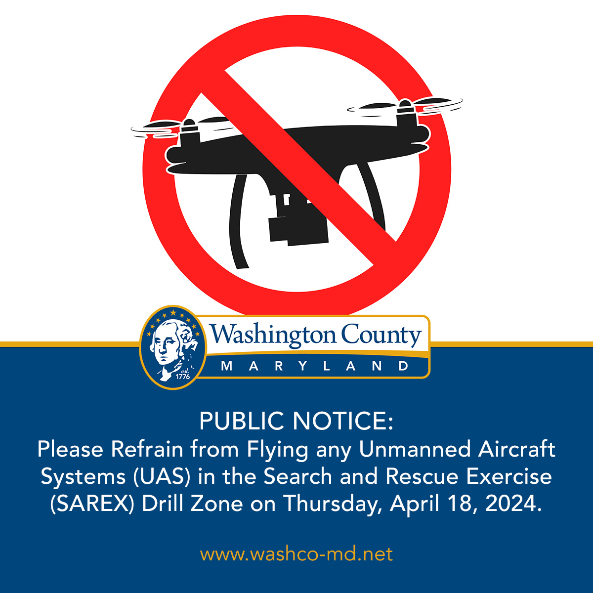 Washington County authorities are issuing a reminder to all drone operators to refrain from flying Unmanned Aircraft Systems (UAS) within the designated Search and Rescue Exercise (SAREX) drill zone today, Thursday, April 18, 2024. This restricted area spans along the Potomac River between Dam 3 and Brunswick, MD.