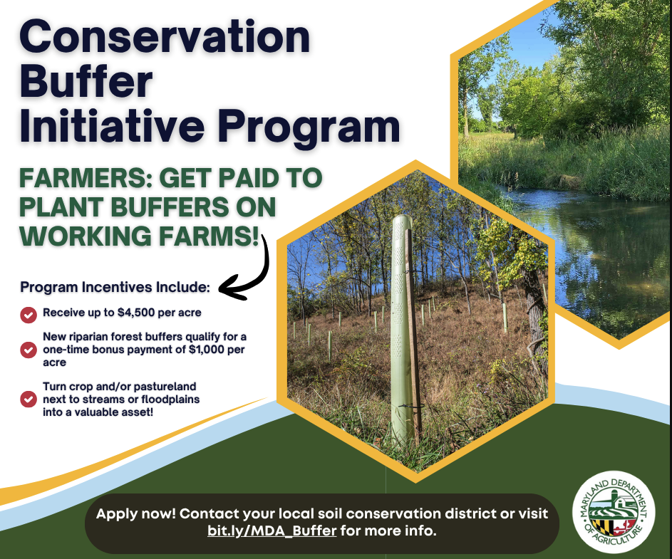 The Maryland Department of Agriculture is excited to announce that the 2025-2026 enrollment period for its popular Conservation Buffer Initiative will run from November 1st, 2025 through April 30, 2026. To help Maryland meet its ambitious tree planting goals, qualifying farmers who plant forest buffers through this program will receive a one-time $1,000/acre signing bonus for trees along with the program’s standard incentive payment.