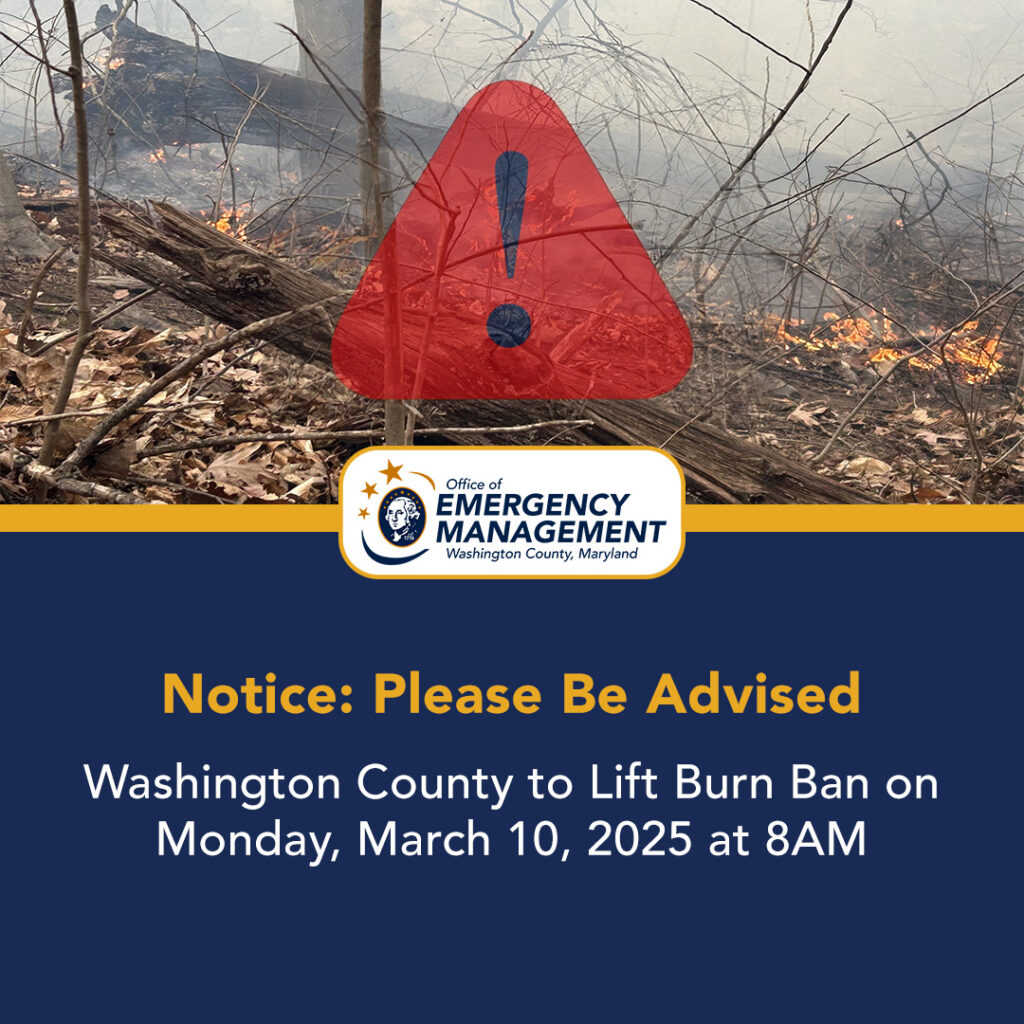 Washington County, MD (March 7, 2025) – The Washington County Office of Emergency Management, by order of the Board of County Commissioners, announces that the countywide burn ban will be lifted on Monday, March 10, 2025, at 8:00 AM.